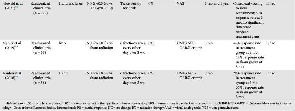 Patients with painful knee osteoarthritis were split into three groups of 38 knees treated to either 3Gy vs 0.3Gy vs 0Gy ( sham placebo). They were only allowed to take Tylenol the first 4 months after radiation and surveys at 4 months showed a 78% vs 58% vs 42% response rate in the three groups, respectively. The trial will report 12 month results with more follow up.