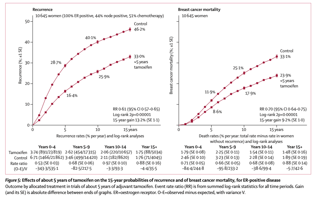 Even after taking the hormone blockers for 5 years, the risk of distant spread and death never goes away. This follow up meta-analysis has several useful charts.