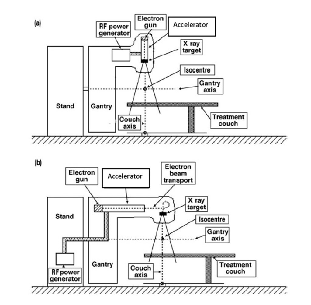 Most patients will be treated on a linear accelerator platform. The schematic below shows the basic parts. Electrons are accelerated through a vacuum tube with high frequency radiowaves to megavoltage energies. When the high energy electrons hit a tungsten metal target, some of its energy gets converted to X rays which are then aimed at the cancer.